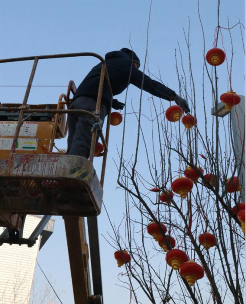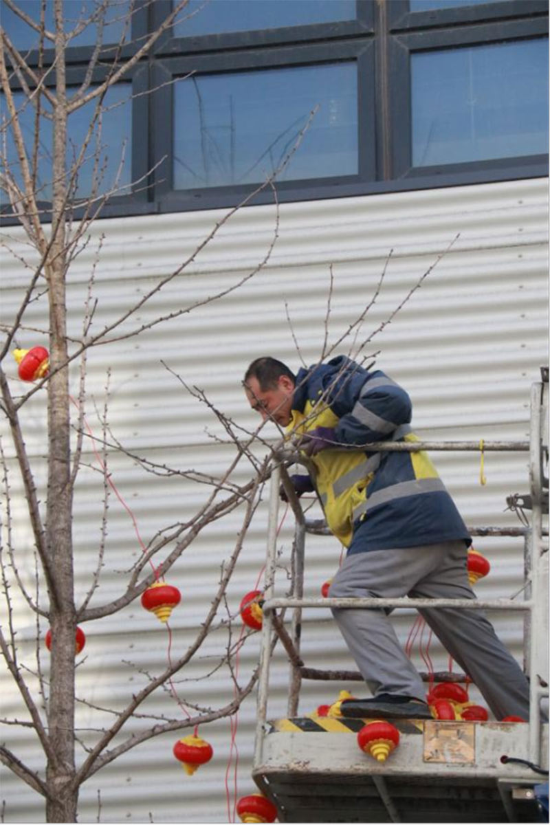 為給園區(qū)營造濃厚的節(jié)日氣氛,給入駐企業(yè)帶來如家般的溫情呵護(hù),沈陽航發(fā)展運(yùn)營管理有限公司物業(yè)團(tuán)隊(duì),在零下二十度的氣溫下,凍紅了雙手,冰覆了睫毛,但他們依然堅(jiān)守,扶梯的扶梯、攀爬的攀爬,將火紅的燈籠掛在園區(qū)主干道、企業(yè)門前。滿街的火紅,是他們對園區(qū)的熱愛,也是對工作的執(zhí)著,更是對崗位責(zé)任的滿滿執(zhí)念。園區(qū)的燈亮了,客戶們洋溢的笑臉,映襯著角落里一道道靚麗的風(fēng)景線,夜幕降臨下,五彩斑斕的彩色燈光給園區(qū)增添了不少喜慶的色彩,也深深的印在了師傅們熱切的心里。